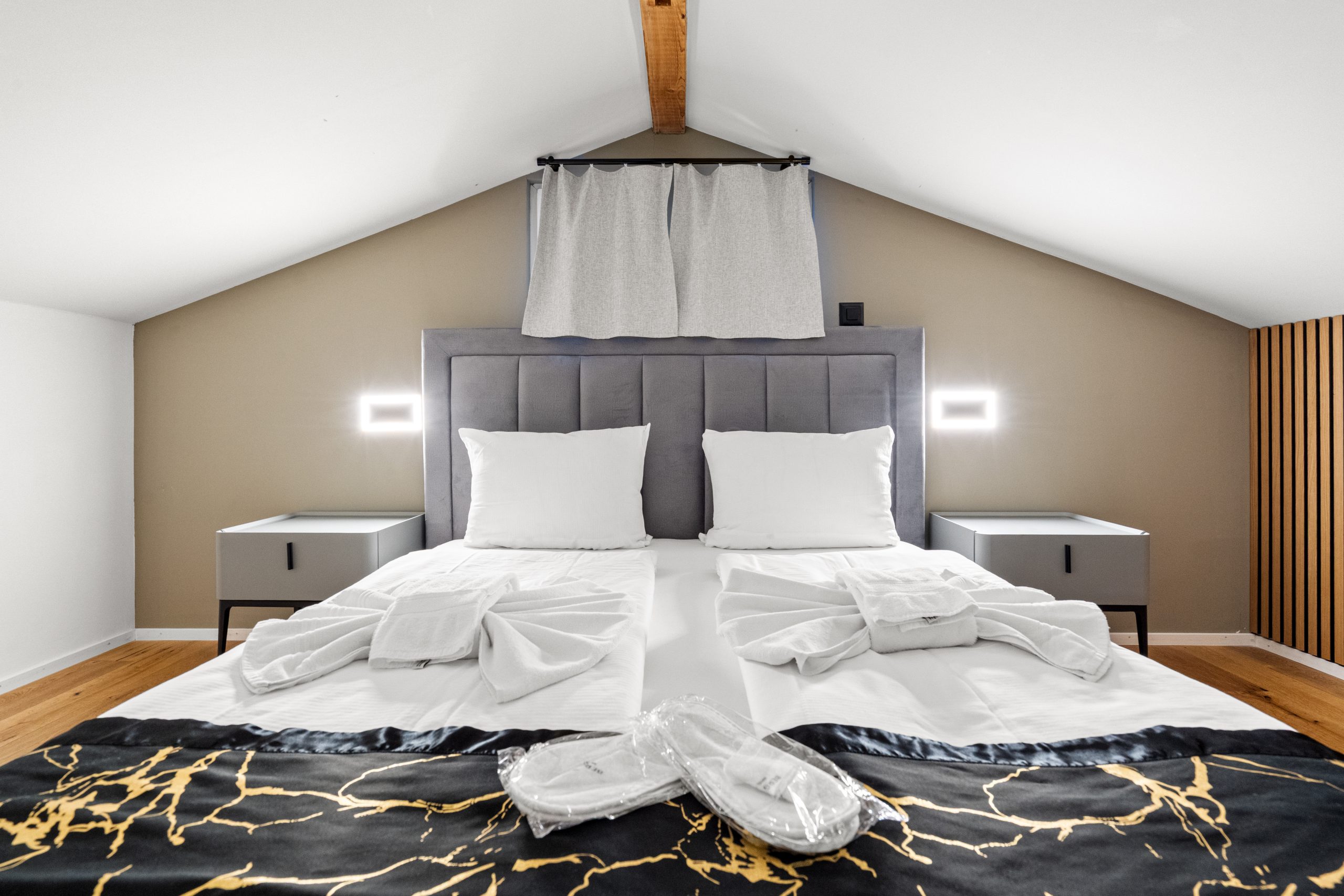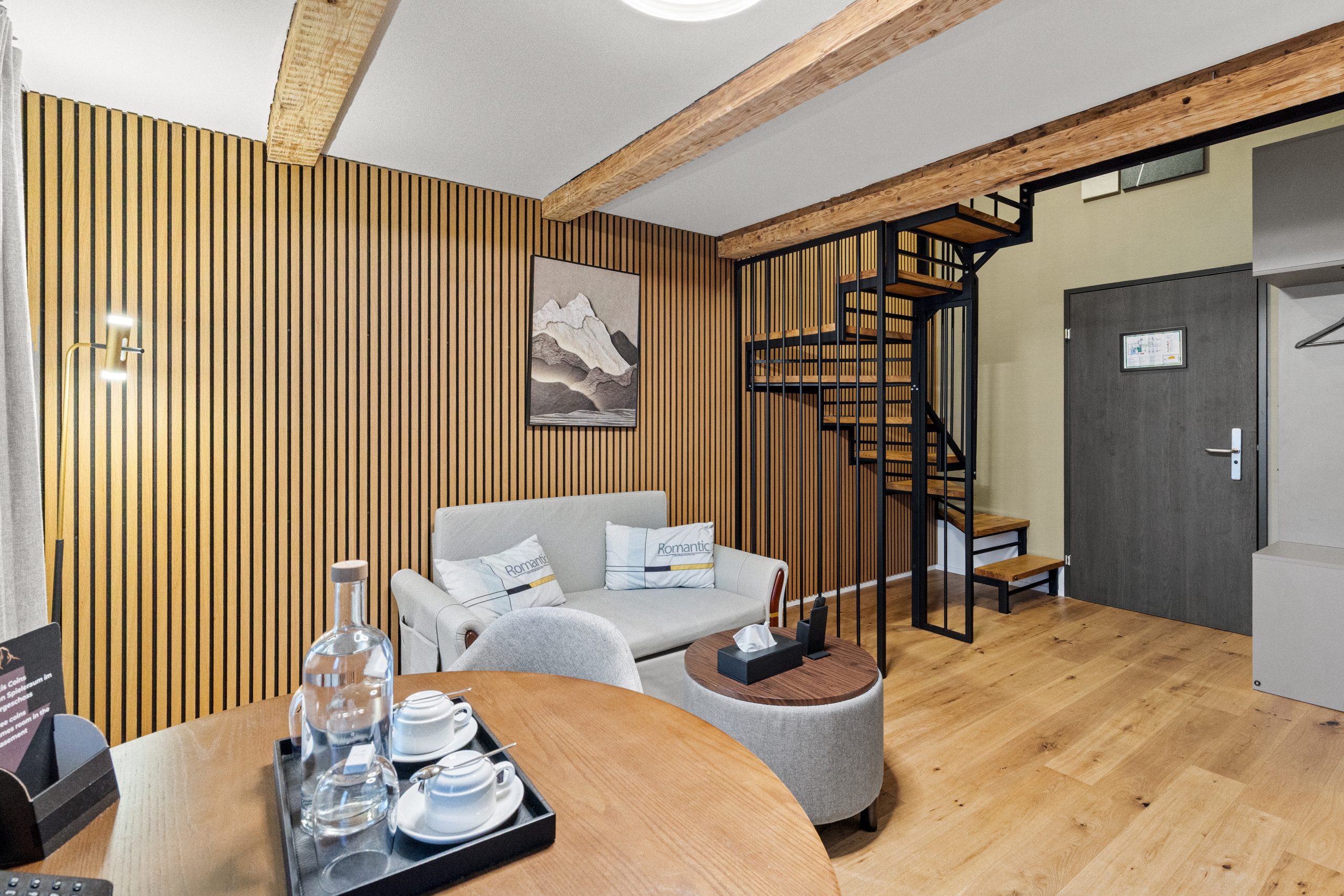 Unser elegantes Maisonette-Studio bietet luxuriösen Komfort auf zwei Etagen. Es ist ausgestattet mit einem luxuriösen Doppelbett, einem praktischen Schlafsofa, einer voll ausgestatteten Küche und einem modernen Badezimmer mit Dusche und Smart-WC. Ein Balkon lädt zum Verweilen und Genießen der frischen Luft ein.