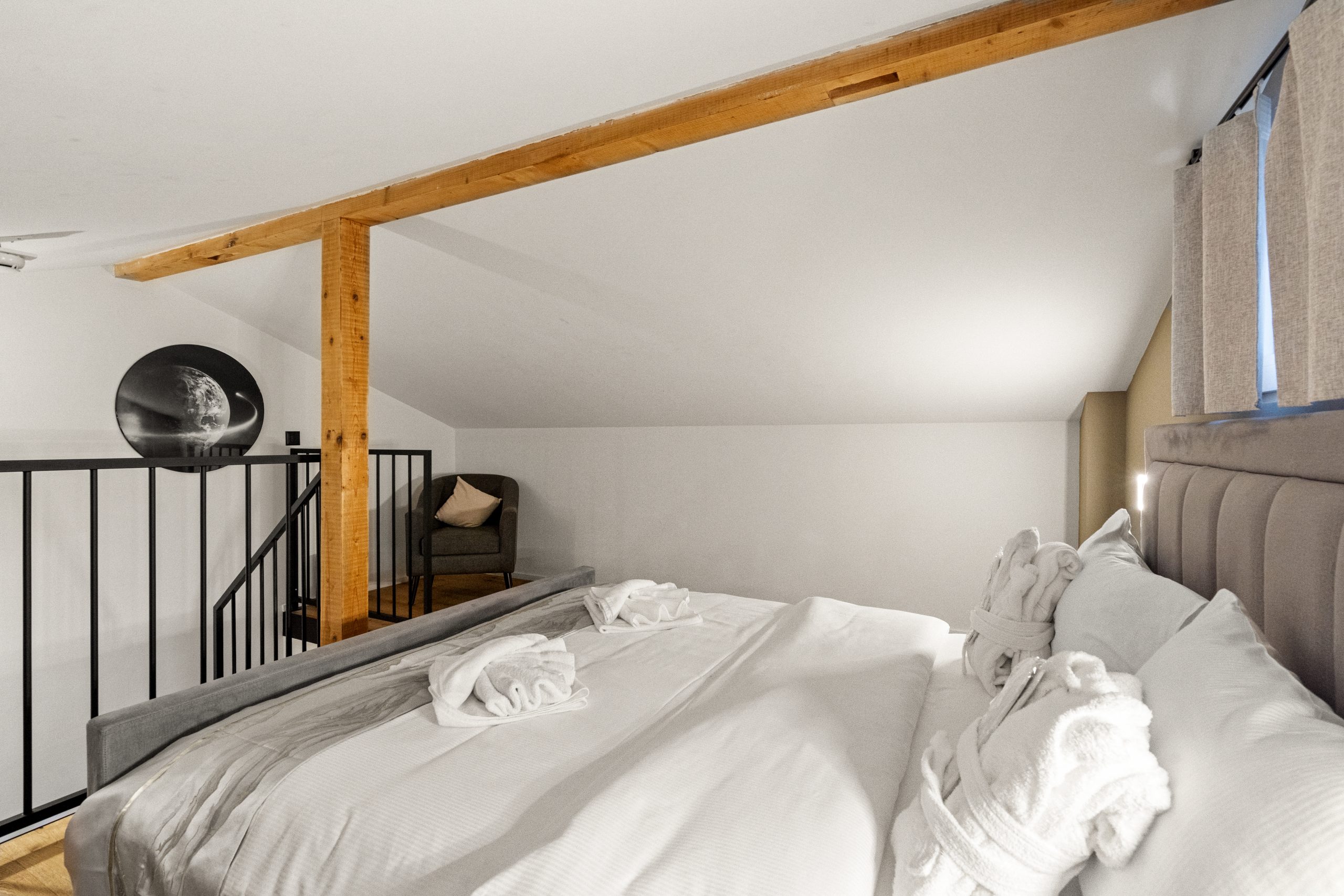 Unser elegantes Maisonette-Studio bietet luxuriösen Komfort auf zwei Etagen. Es ist ausgestattet mit einem luxuriösen Doppelbett, einem praktischen Schlafsofa, einer voll ausgestatteten Küche und einem modernen Badezimmer mit Dusche und Smart-WC. Ein Balkon lädt zum Verweilen und Genießen der frischen Luft ein.